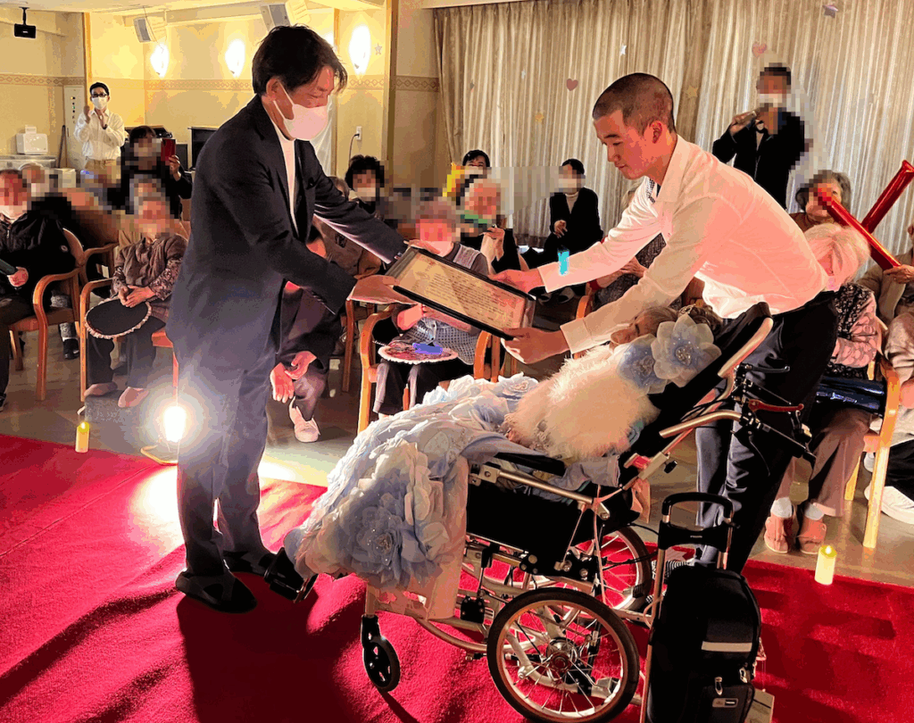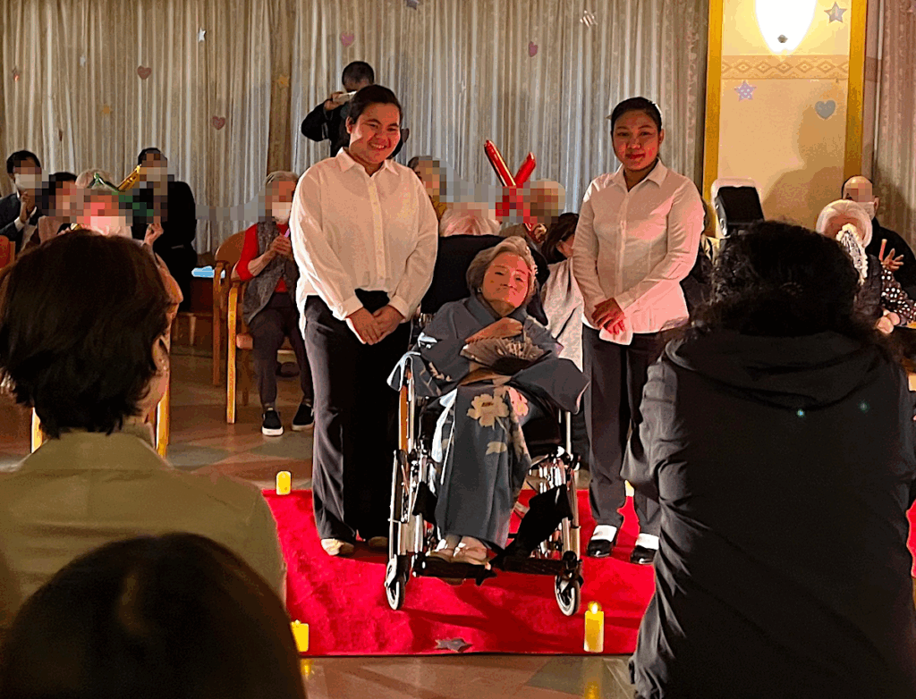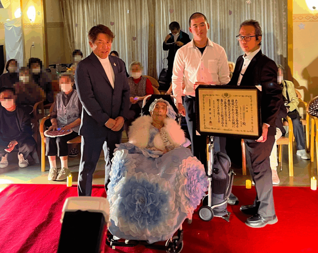 注目すべきは、最高齢101歳の方の出演です。令和6年9月に内閣総理大臣からいただいた「お祝い状」を、総合施設長の百武氏が手渡される場面は、会場全体が温かい拍手に包まれる感動的な瞬間でした。