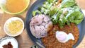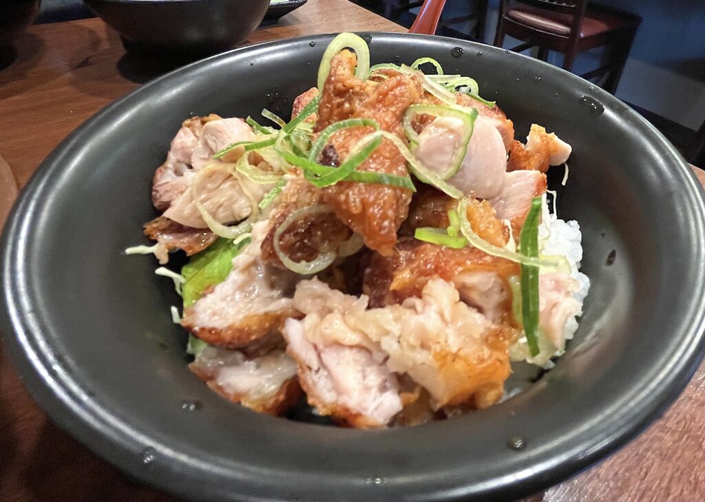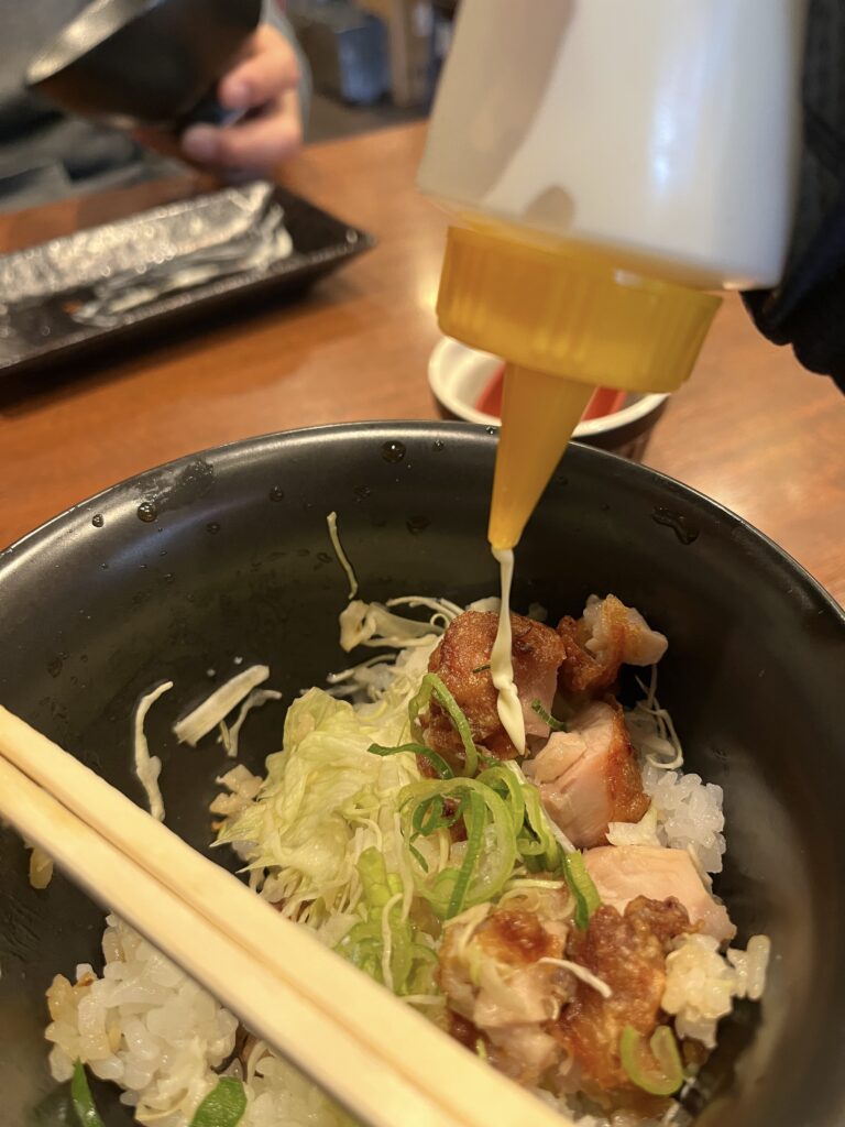 カラアゲ丼には自家製の塩だれで下味をつけた鶏の唐揚げがのっていて、ほんのりゆずポン酢の酸味が効いています。奥さんからのアドバイスで、マヨネーズを追加すると味の変化も楽しめるんです。