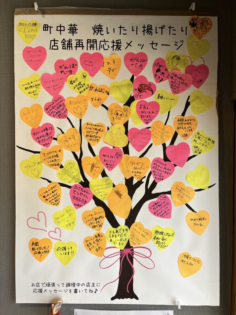 レジ裏の壁には、店舗再開を応援するメッセージが貼られていて、多くの人々との絆の深さを感じさせられました。