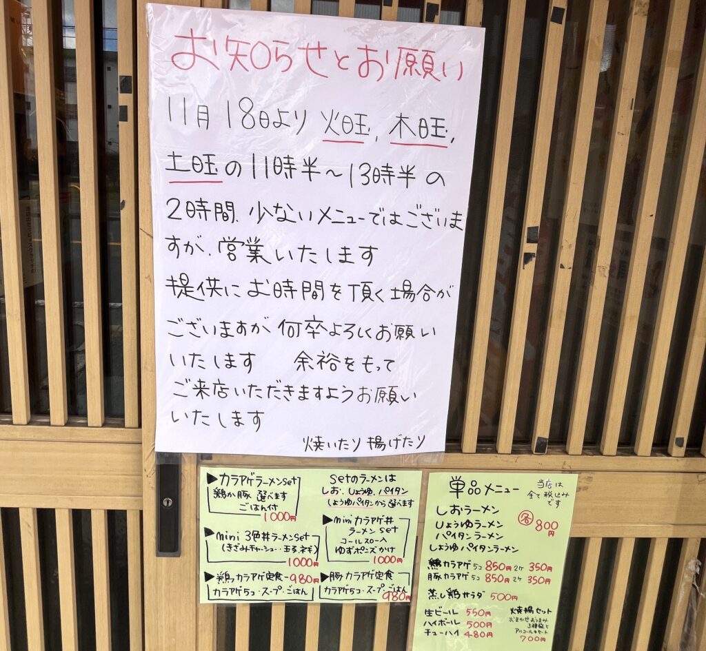 備考: 体調に合わせた営業のため、余裕を持った時間帯での来店がおすすめです。